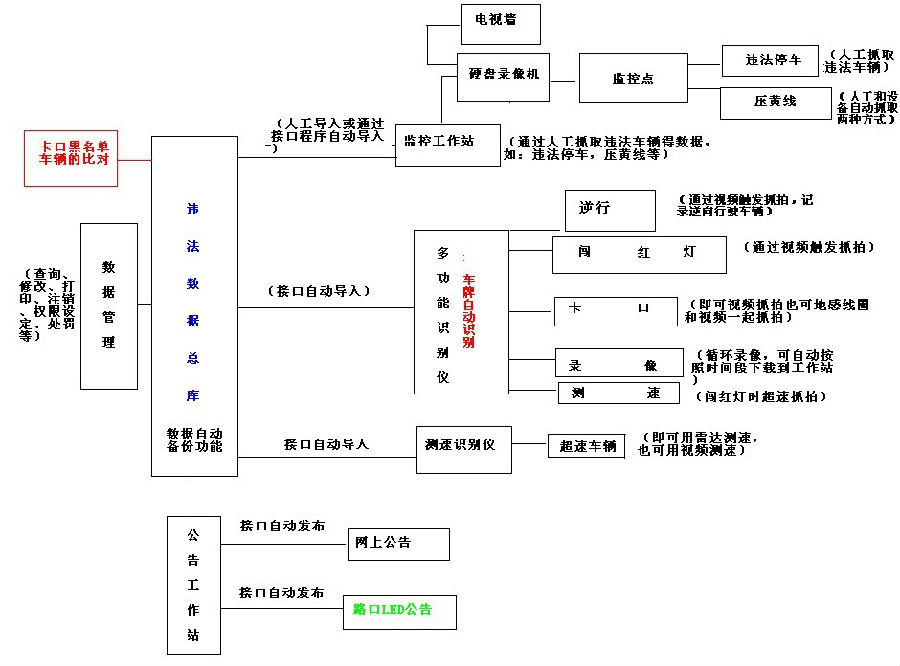 高清智能一體機的全功能高清電子警察系統,摒棄了使用工控機或DSP嵌入式設備做控制主機的傳統前端系統結構,并且無需紅綠燈信號檢測器。只需一臺高清智能一體機就可以同時實現對闖紅燈、不按規定車道行駛(直行車道左右拐、右拐車道直行、左拐車道直行、違法占用非機動車道等)、逆向行駛、壓黃線等違法行為的監測,以及治安卡口、交通流量統計、高清錄像等多種功能。